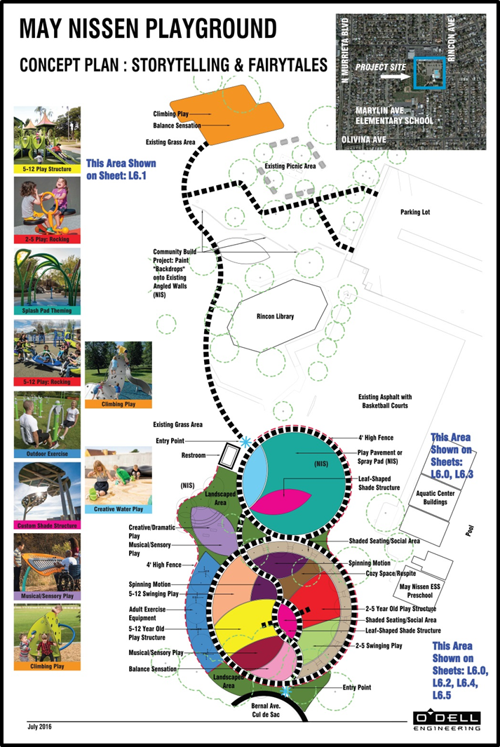 Scope of work includes renovation playground with a storybook theme, additional restroom facility. Budget was approved in March 2018. Project bid opening was on June 27, 2018 and was awarded to Goodland Landscape Construction Inc. Construction began in fall 2018. Construction was completed in November 2019.